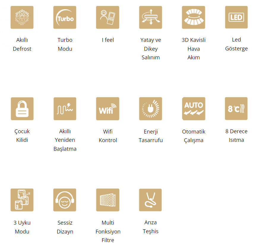 | Montaj | Ürünümüzü satın alan müşterilerimize sevkiyat, montaj hizmetimiz ve 4 metreye kadar bakır borulama ücretsizdir. Elektrik tesisatıyla ilgili işlemler (uygun kesitte enerji kablosu, sigorta vb.) yetkin bir elektrikçiye yaptırılacak şekilde müşterimize aittir. İnşaat işleri (kırım, karot vb.) ve montaj için gerekli özel ekipmanlar (manlift, iskele vb.) gerektiği durumlarda müşteriye aittir. |
